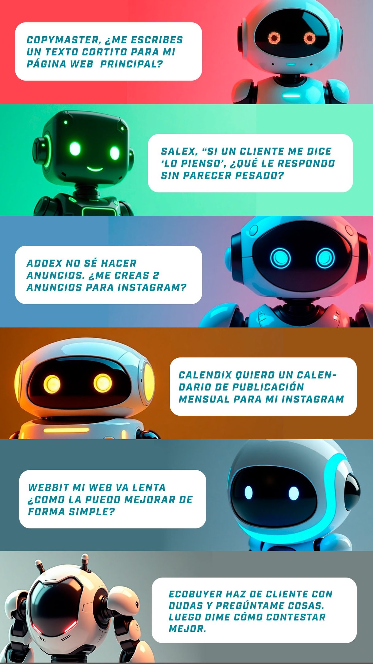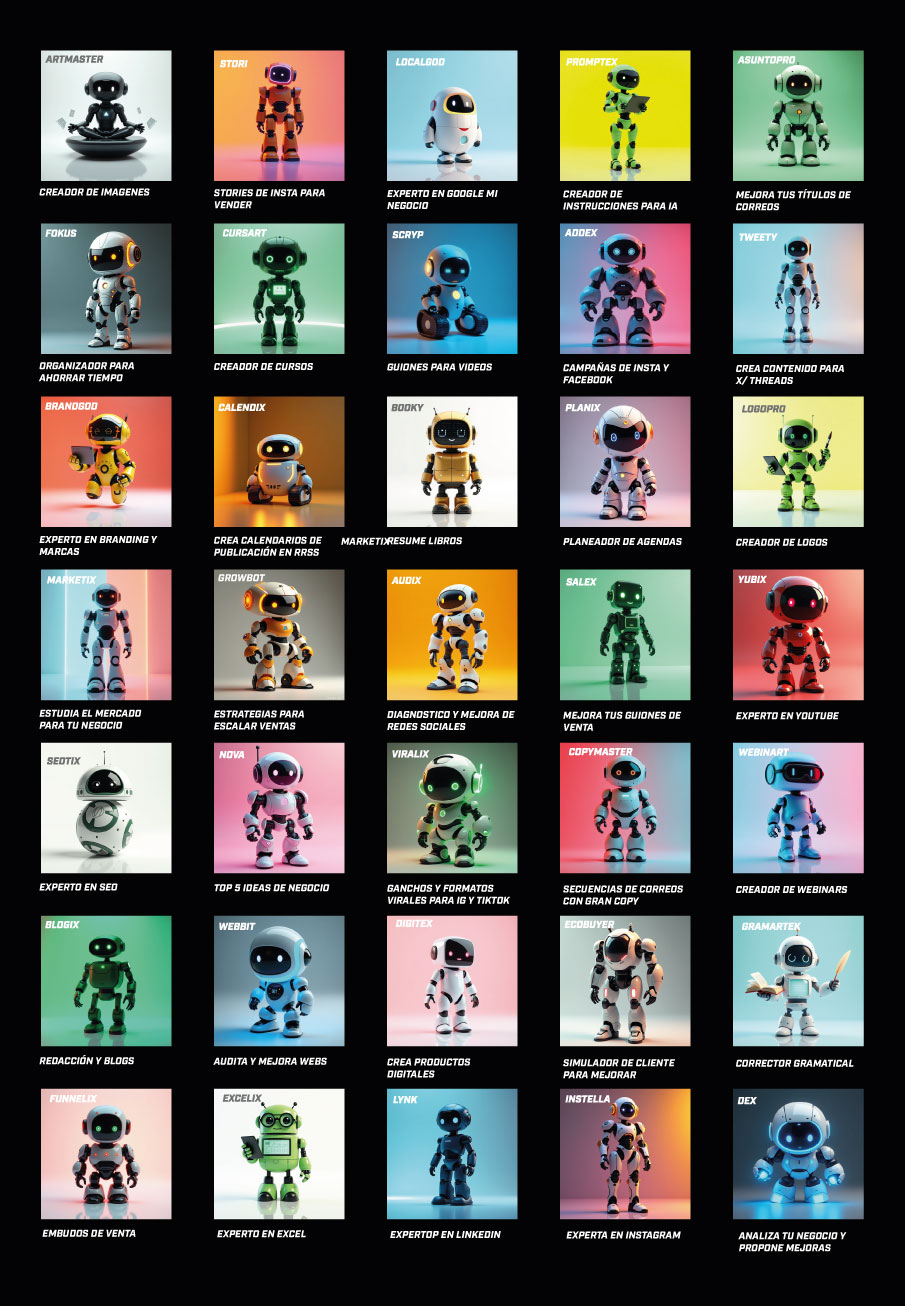 Son asistentes preconfigurados con rol, prompts y flujos para tareas concretas (captación, copy, follow-up, soporte, research, etc.).